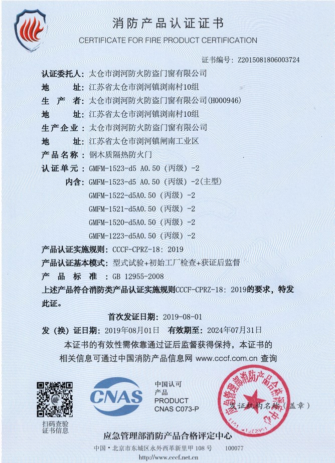 钢木质防火门证书
